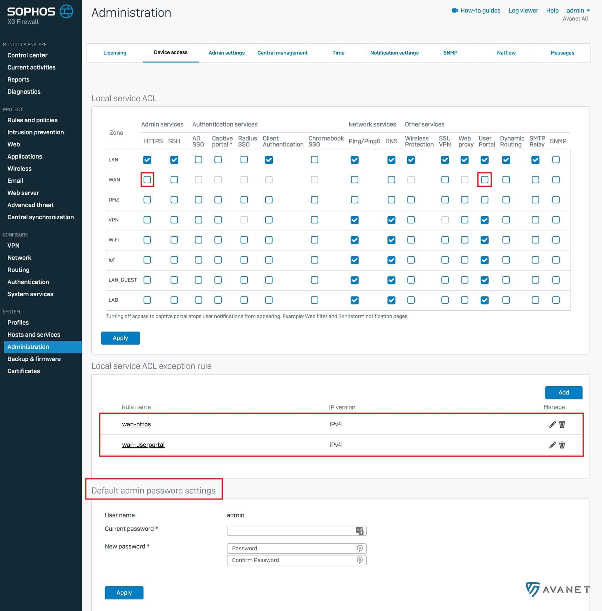 - The screenshot shows which checkboxes should not be enabled – these would allow access to the firewall from the internet.
