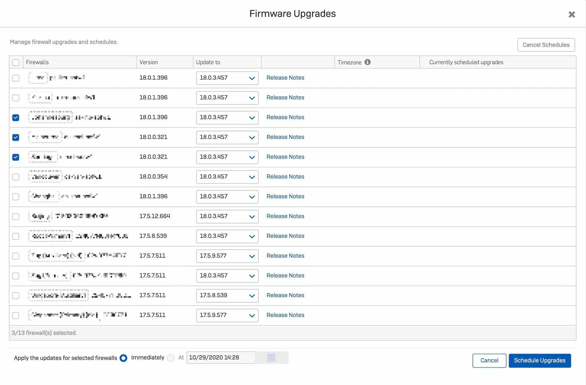 Per un aggiornamento pianificato si possono selezionare anche più firewall contemporaneamente, il che rappresenta un enorme sollievo negli ambienti più grandi.