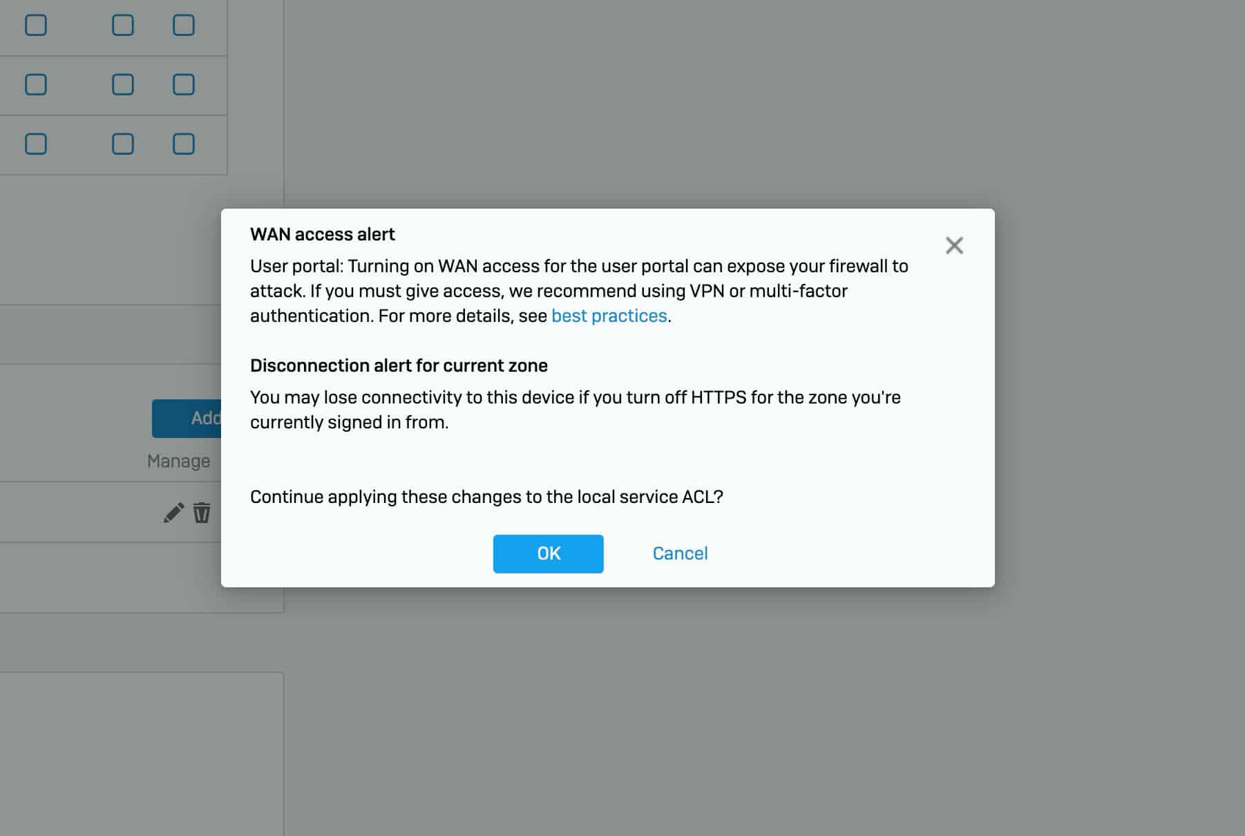 Qui bisognerebbe seguire il seguente principio: chiudere tutto e aprire solo consapevolmente. Ad esempio, selezionando la casella “Ping” o “User Portal”, consentite a qualsiasi computer nel mondo di raggiungere il vostro firewall via ICMP o tramite User Portal.