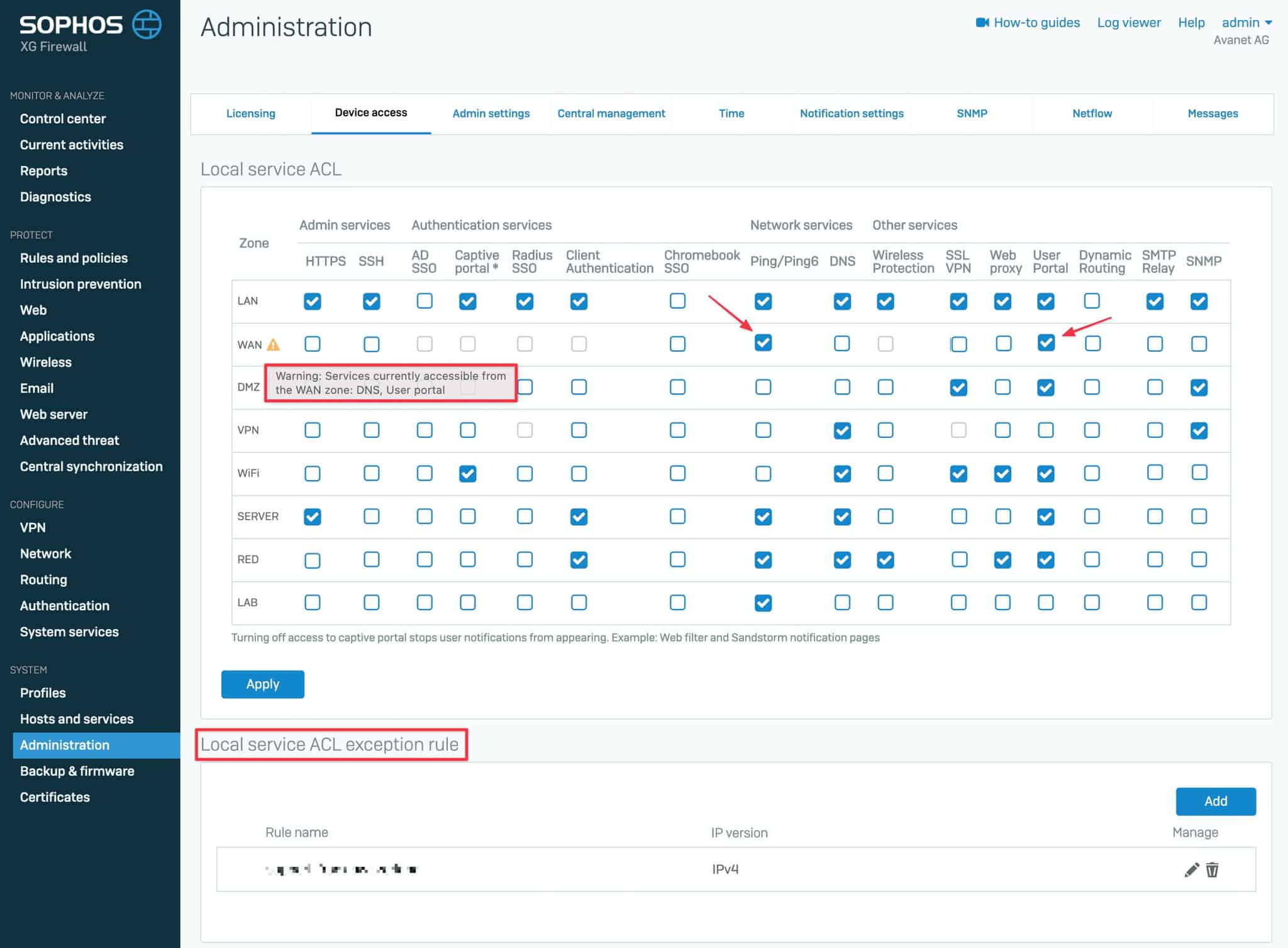 È meglio usare la “Local service ACL exception rule” per definire con maggiore precisione da dove il traffico è consentito. Ad esempio, per l’accesso allo User Portal selezionate solo il vostro Paese, oppure per il ping solo gli IP che possono effettivamente raggiungere il firewall tramite ICMP.