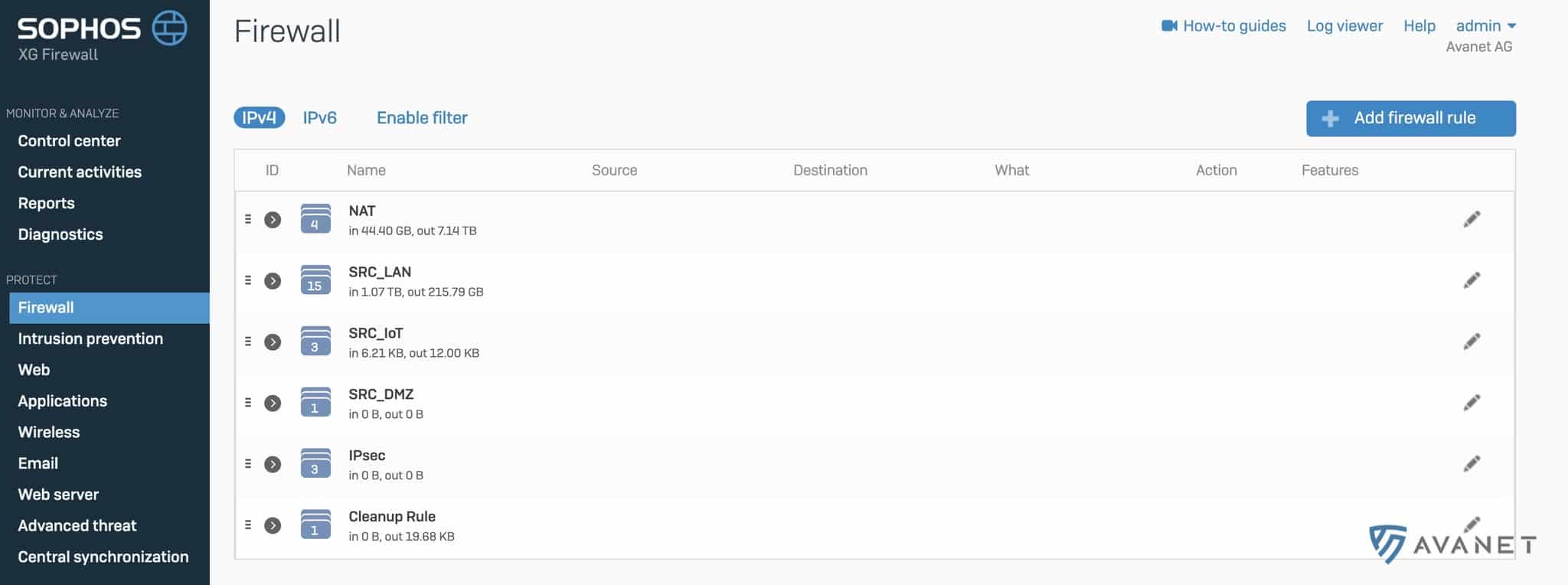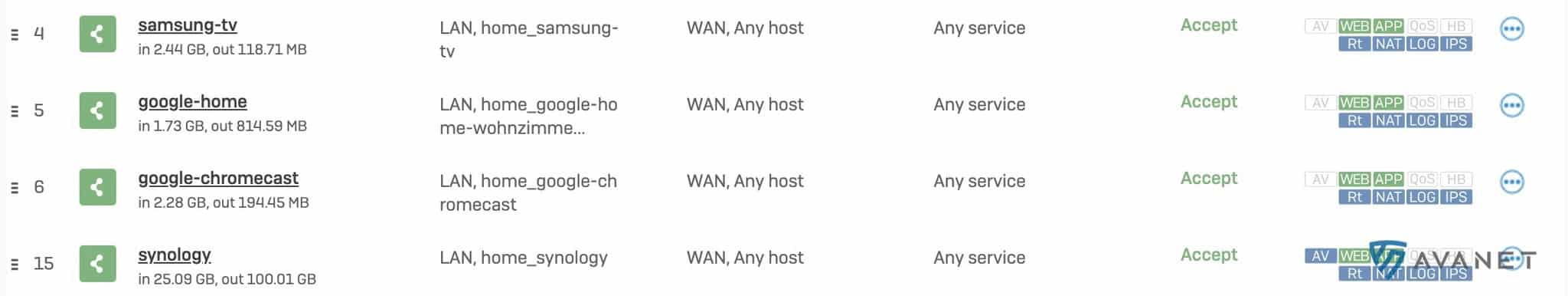 Het firewallreglement is met SFOS een stuk overzichtelijker geworden. Als je meer dan 10 firewallregels hebt, wat waarschijnlijk in de meeste omgevingen het geval zal zijn, kunnen deze in SFOS uitstekend worden gegroepeerd. De volgende screenshot van mijn XG Firewall thuis moet dit nog eens duidelijk maken. Hier hebben alle IoT-apparaten hun eigen netwerk en de firewallregels daarvoor worden allemaal in één groep samengevat.