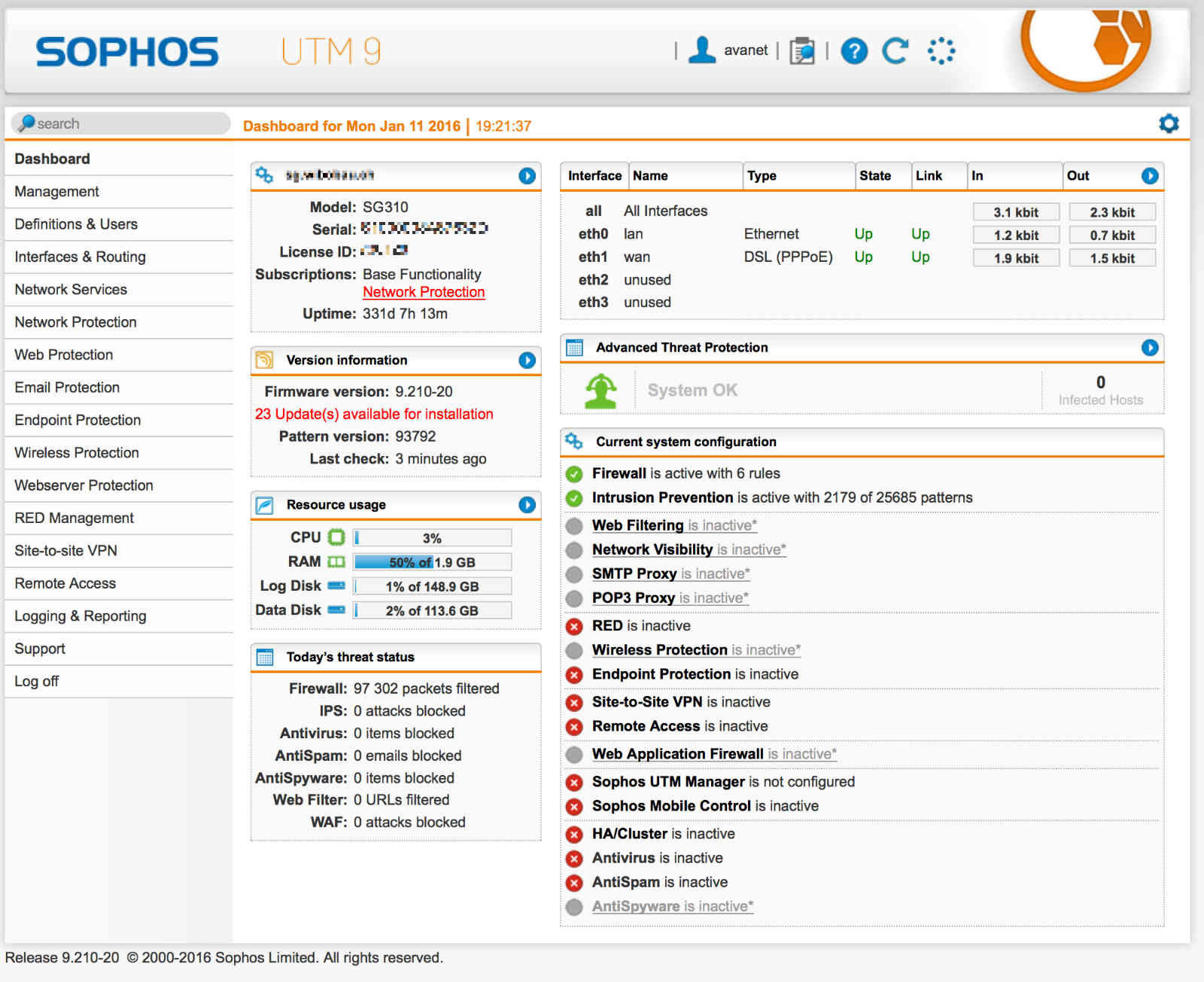 Laten we dat eens aan de hand van een concreet voorbeeld bekijken. Hier zien jullie het dashboard van een Sophos SG 310.