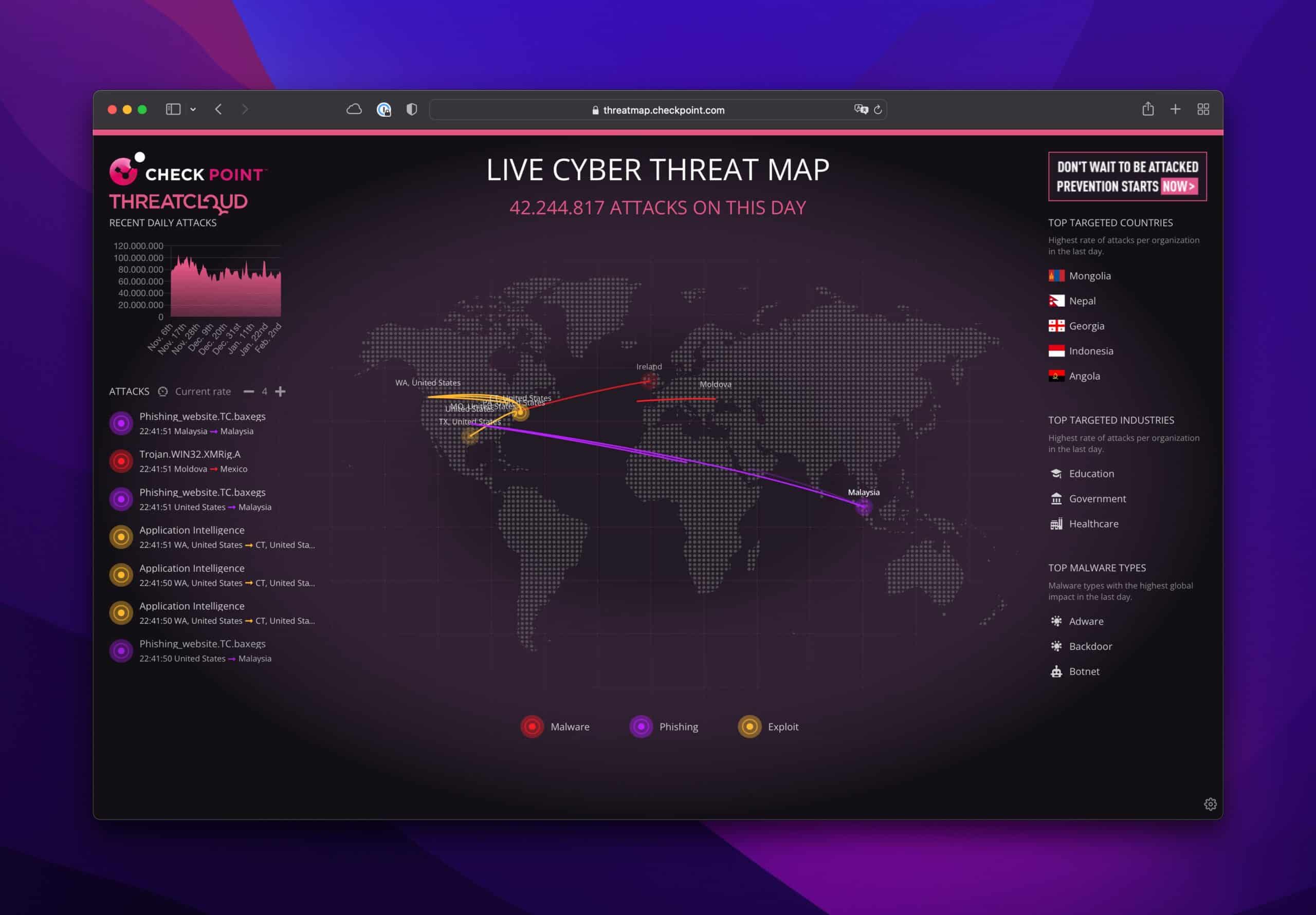 Threat Cloud van Check Point toont eveneens aanvaldata. Er is ook een ranking met de belangrijkste doelwitten per land.