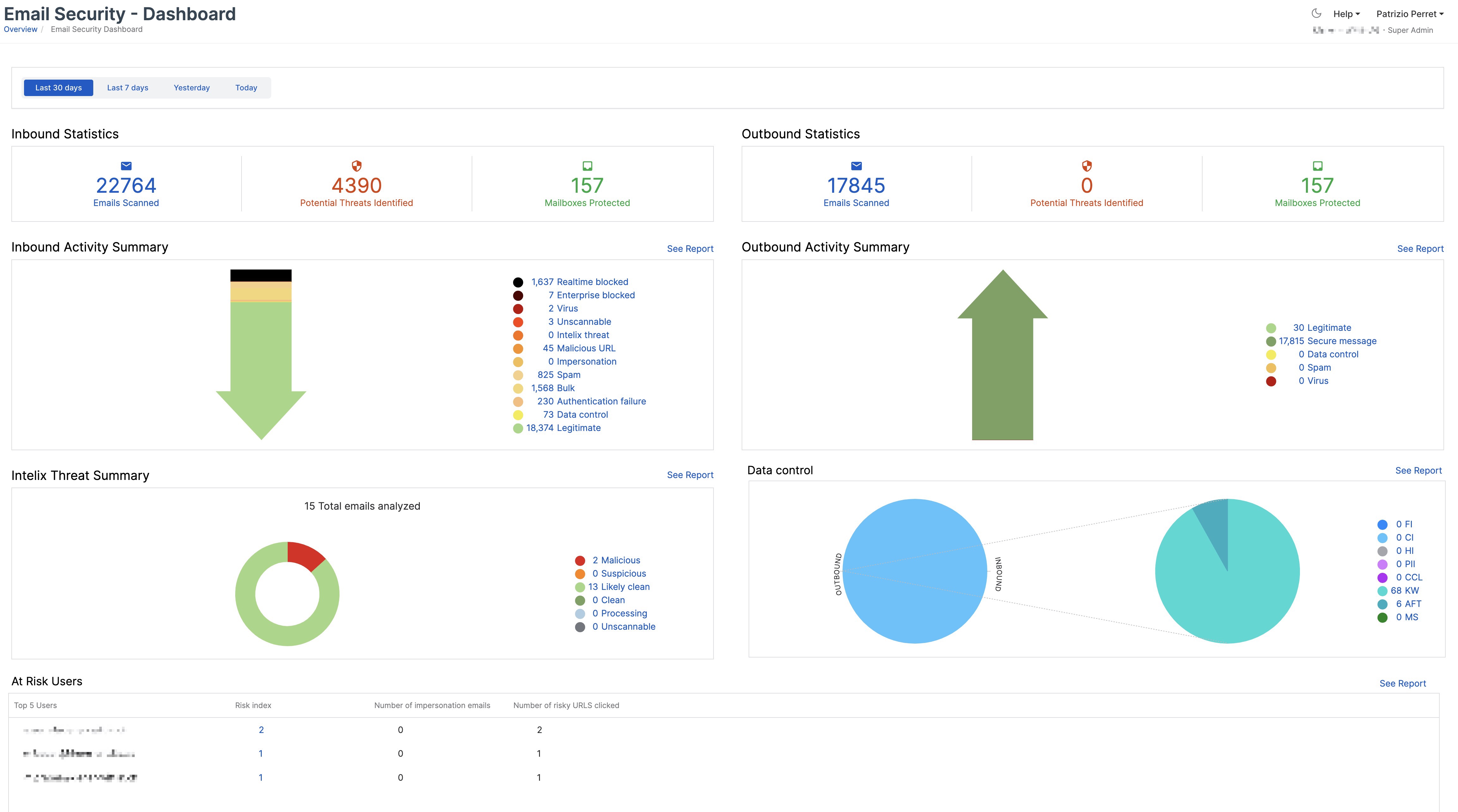 Het gegevenscontrole diagram (voorheen aangeduid als DLP) is bijgewerkt om een splitsing te tonen tussen inkomende en uitgaande berichten in het cirkeldiagram links en een verdere categorisering van berichten per gegevenscontrole regeltype in het cirkeldiagram rechts.
