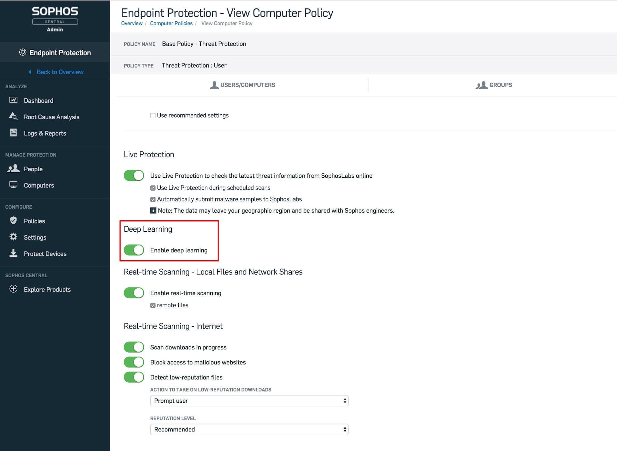 Als je in Sophos Central de aanbevolen instellingen van Sophos gebruikt, wordt deze nieuwe technologie automatisch geactiveerd. Om zeker te weten of Deep Learning bij jullie daadwerkelijk is ingeschakeld, kun je als volgt te werk gaan: