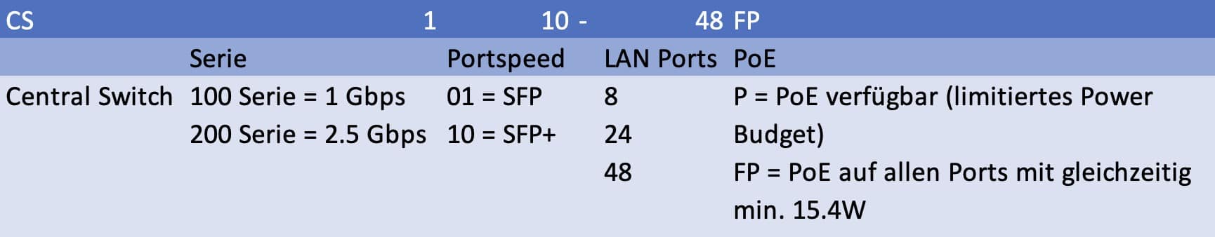 We beginnen met wat we al weten over de hardware van de Sophos Switches. Om te voorkomen dat men verdwaalt in de modelnamen of alle verschillen uit de producttabel moet halen, leggen we eerst het naamgevingsschema uit en daarmee de belangrijkste hardwareverschillen. De naam van de Sophos-switchmodellen zegt namelijk al veel over de technische specificaties. In de volgende afbeelding wordt als voorbeeld de switch CS110-48FP getoond: