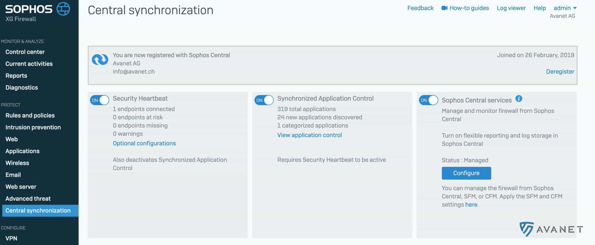 Para utilizar as funções de gestão dos firewalls, é necessário uma conta Sophos Central. Esta conta pode ser criada gratuitamente e a própria gestão de firewalls também não tem custos adicionais. No backend do firewall, é possível registar‑se no Sophos Central através do menu «Central synchronization». O firewall fica então associado ao Central.