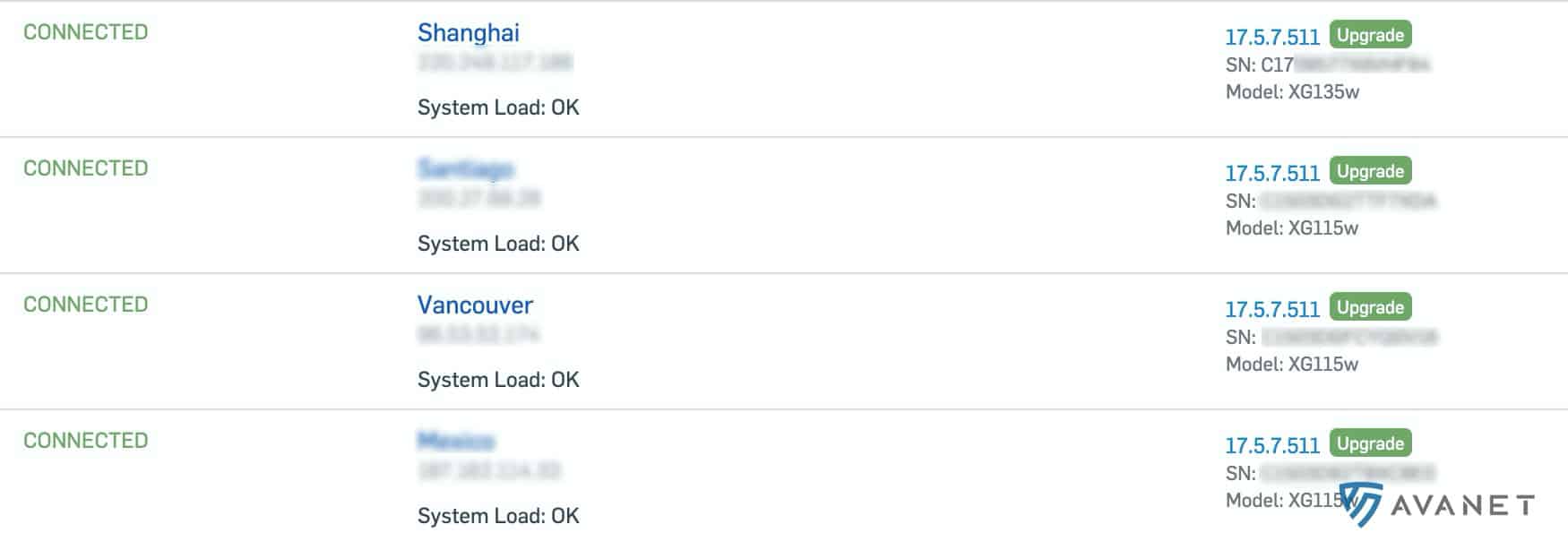 Na vista geral dos firewalls, pode ver à primeira vista que versão de firmware está instalada em cada modelo. Com um clique em «Upgrade» e depois em «Upgrade Firmware», pode distribuir a versão mais recente disponível.