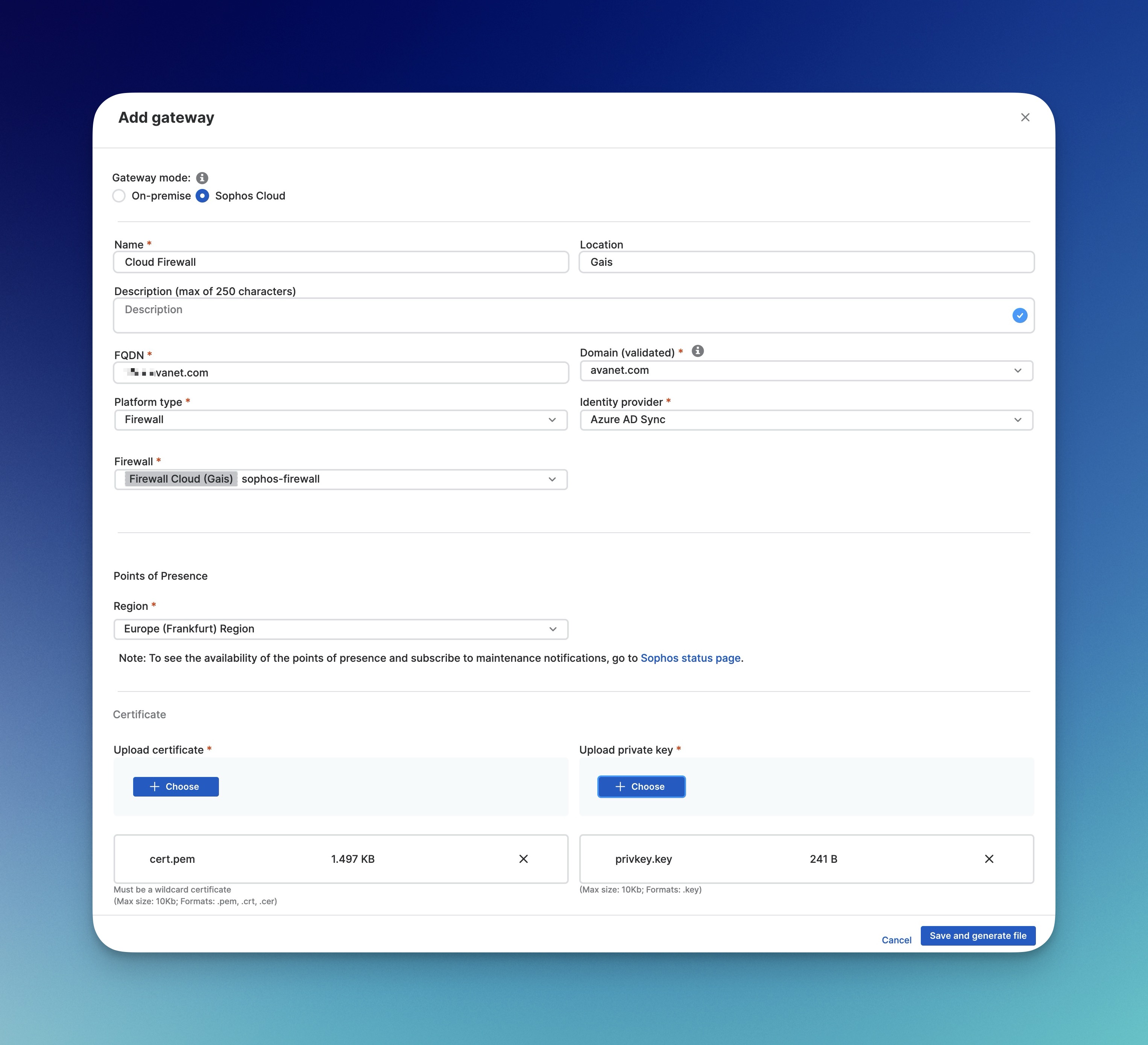 Sophos Cloud Gateway: Em contraste, o Sophos Cloud Gateway oferece uma implementação de rede segura e isolada através da utilização de uma Sophos Cloud. Este modo garante uma disponibilidade de 99,999% e permite uma ligação simples dos utilizadores às aplicações, sem a necessidade de abrir portas da firewall ou criar regras NAT. Uma desvantagem, no entanto, é o limite de tráfego de 15 GB por utilizador por mês, que pode ser rapidamente atingido ao ser utilizado para unidades de rede.