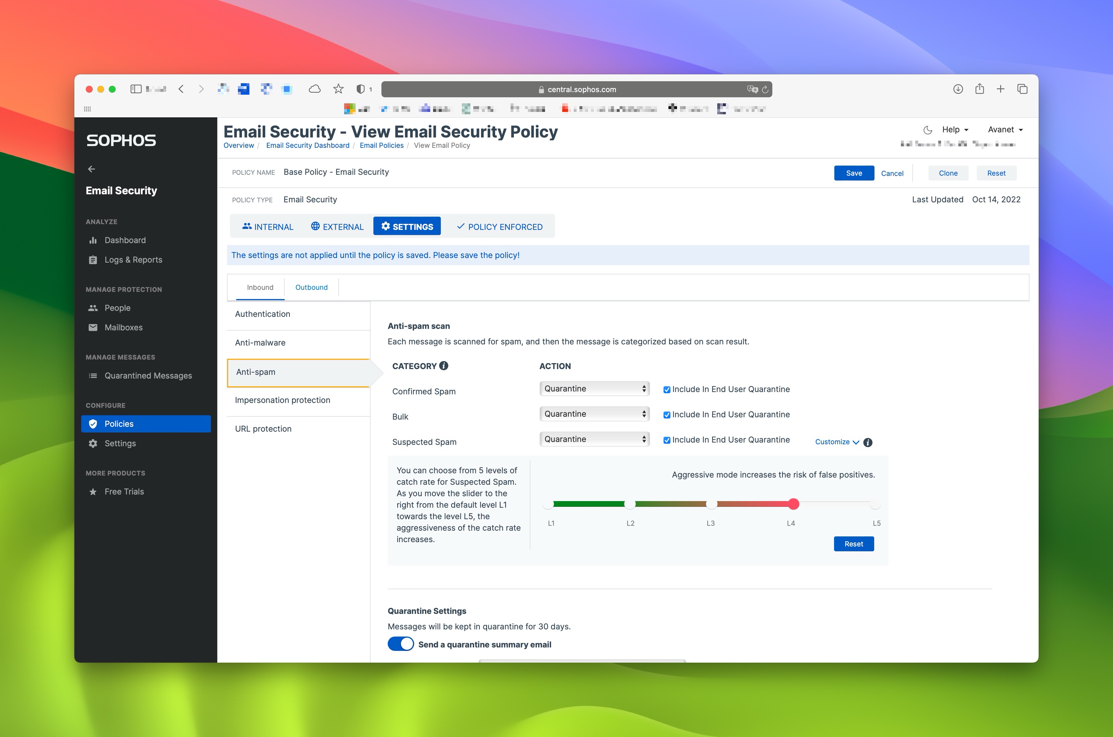 Sophos Central Emails karantänsfunktioner erbjuder administratörer mer flexibilitet och kontroll över hanteringen av karantänsatta e-postmeddelanden och deras bilagor. Det möjliggör en säkrare hantering av potentiellt farligt innehåll och tillhandahåller ytterligare verktyg för analys och verifiering. Att klona e-postsäkerhetspolicyer förenklar hanteringen och implementeringen. Dessa förbättringar är ytterligare ett steg från Sophos för att hjälpa administratörer att hålla sina system säkra.
