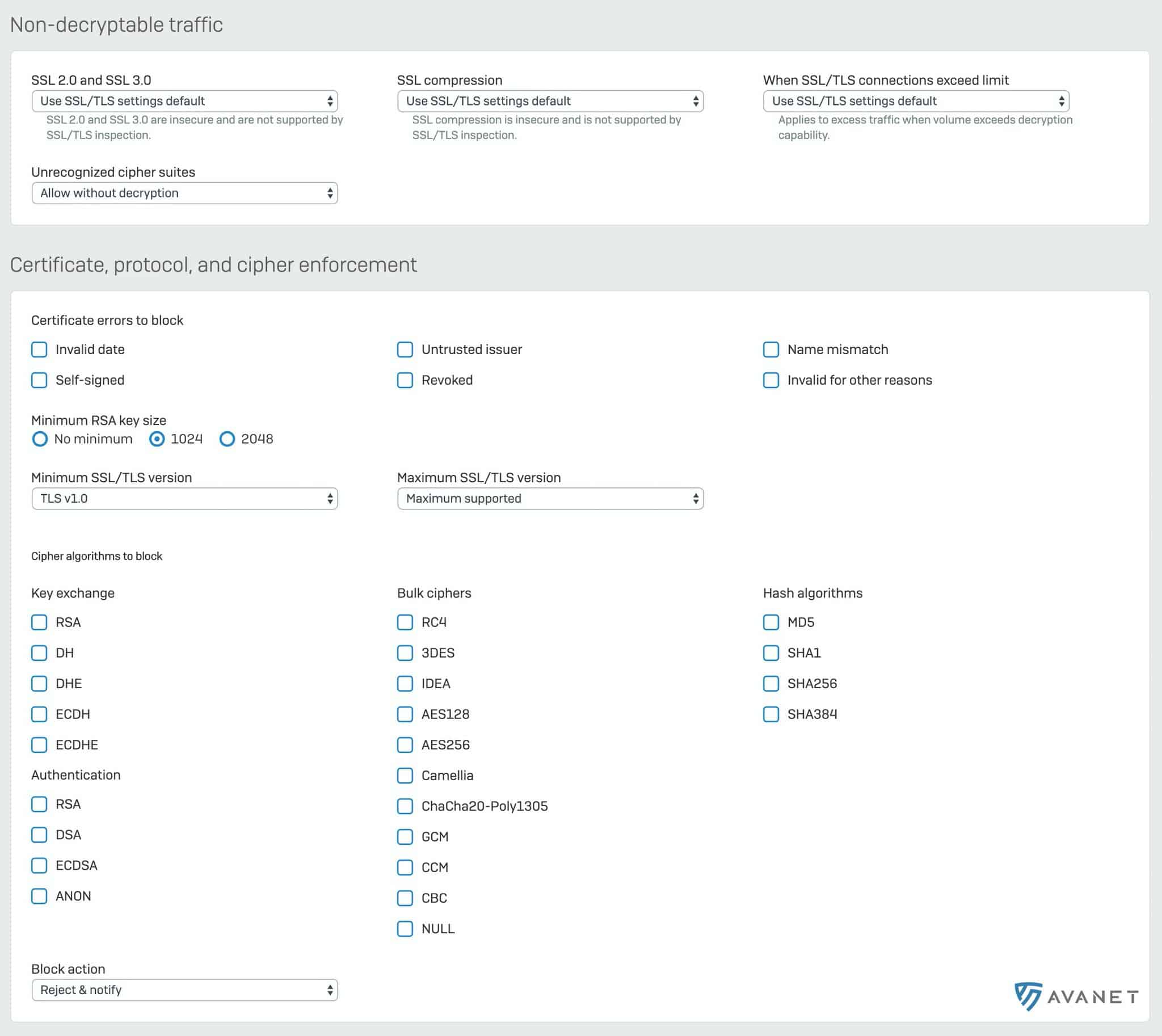 De viktigaste inställningarna kan definieras per dekrypteringsprofil. Dessa omfattar till exempel alternativ för att hoppa över trafik när ömsesidig autentisering har konfigurerats mellan klient och server och brandväggen inte kan inspektera certifikatet.