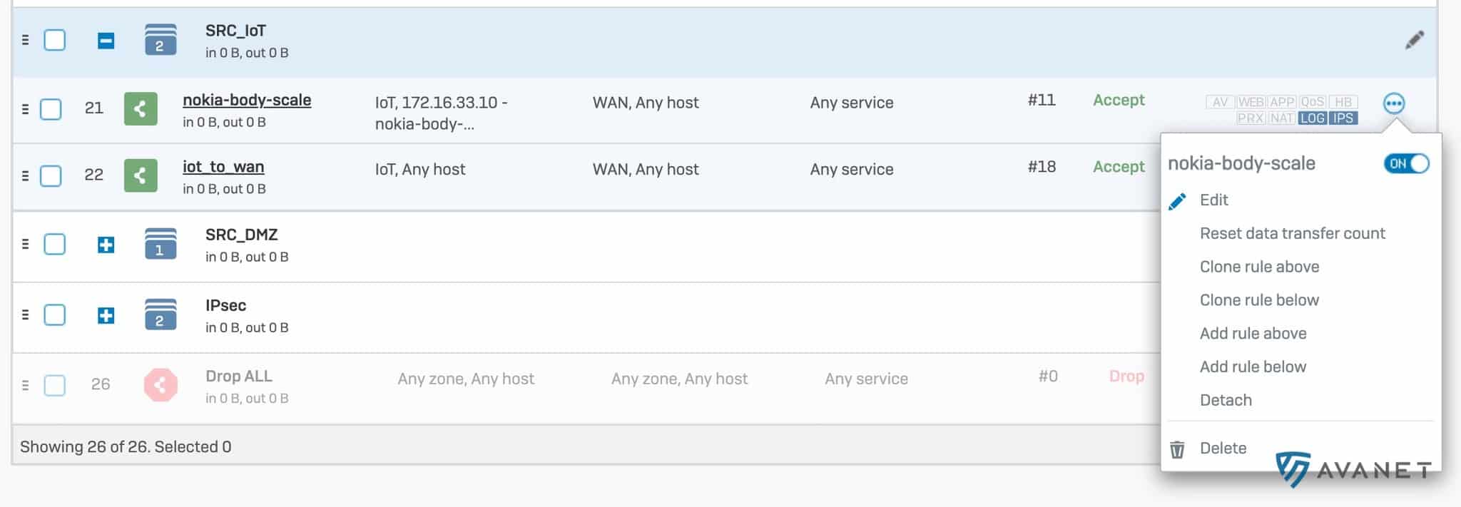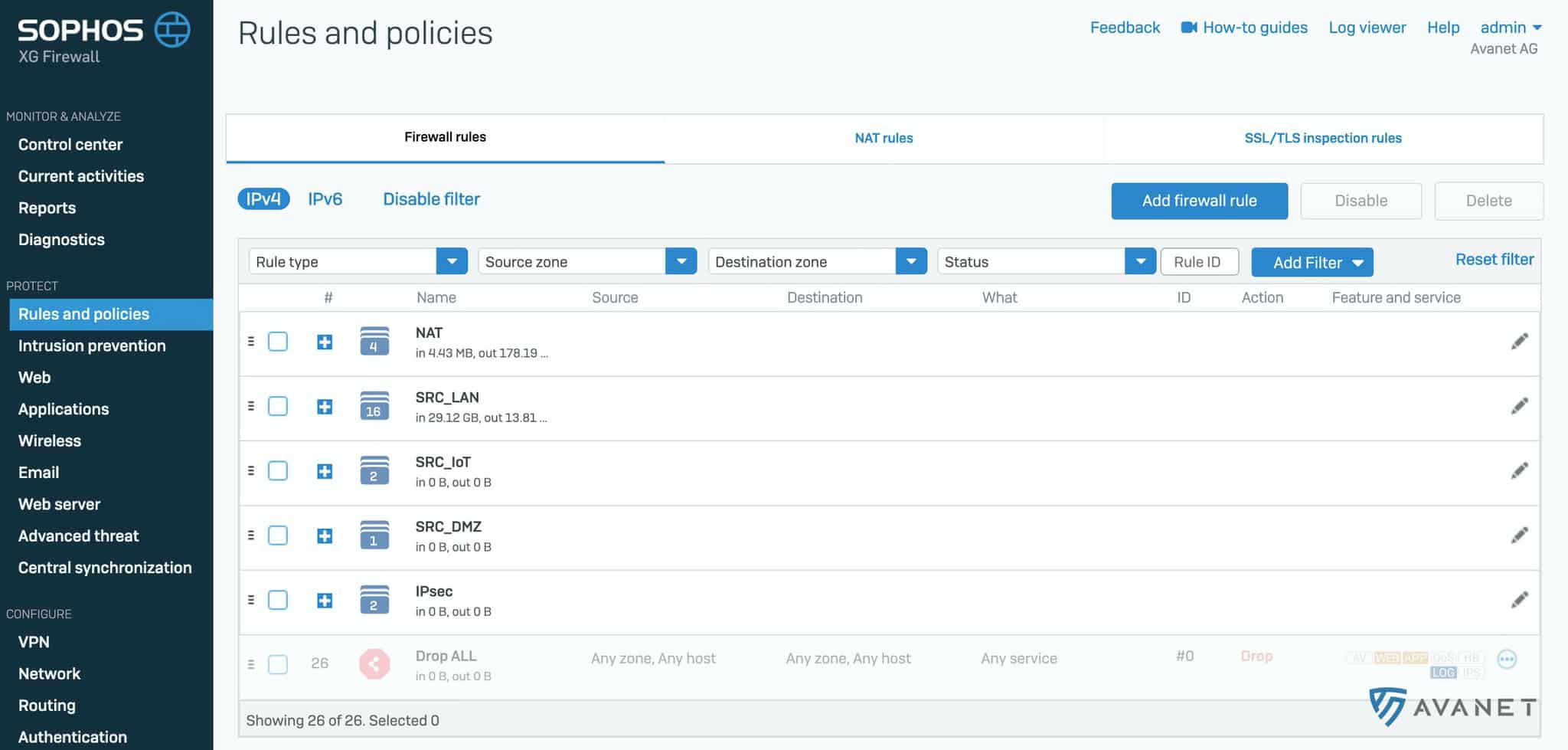 Med varje ny huvudversion förbättrar Sophos hanteringen av brandväggsregler. I v18 kan man nu markera flera brandväggsregler samtidigt för att ta bort dem, aktivera eller inaktivera dem eller lägga dem till i en grupp eller ta bort dem från en grupp. Dessutom är brandväggsreglerna nu numrerade, vilket gör att det totala antalet syns direkt. Regel‑ID:t förblir oförändrat. Menyposten ”Firewall” har också bytt namn till ”Rules and policies”.