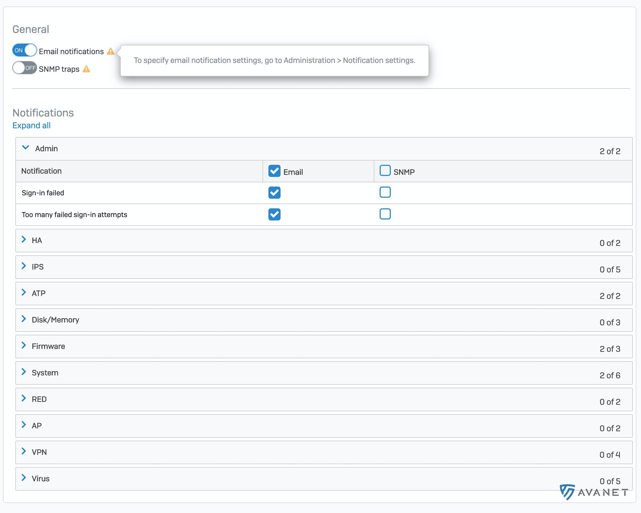 Under ”Administration” > ”Notification settings” fanns tidigare bara två alternativ som kunde aktiveras för e‑postaviseringar: