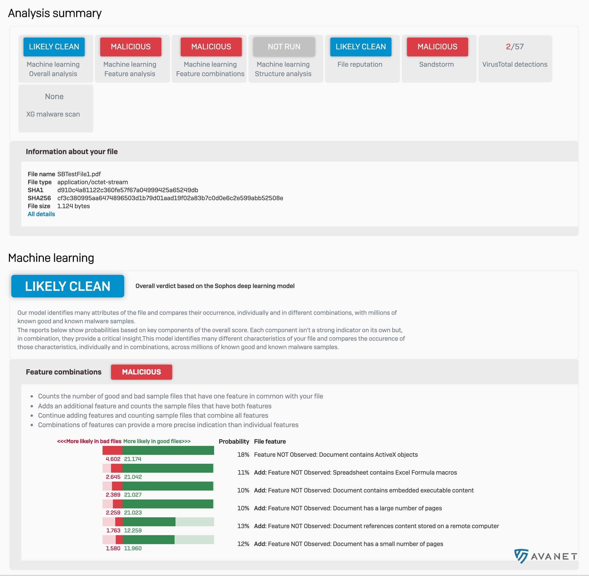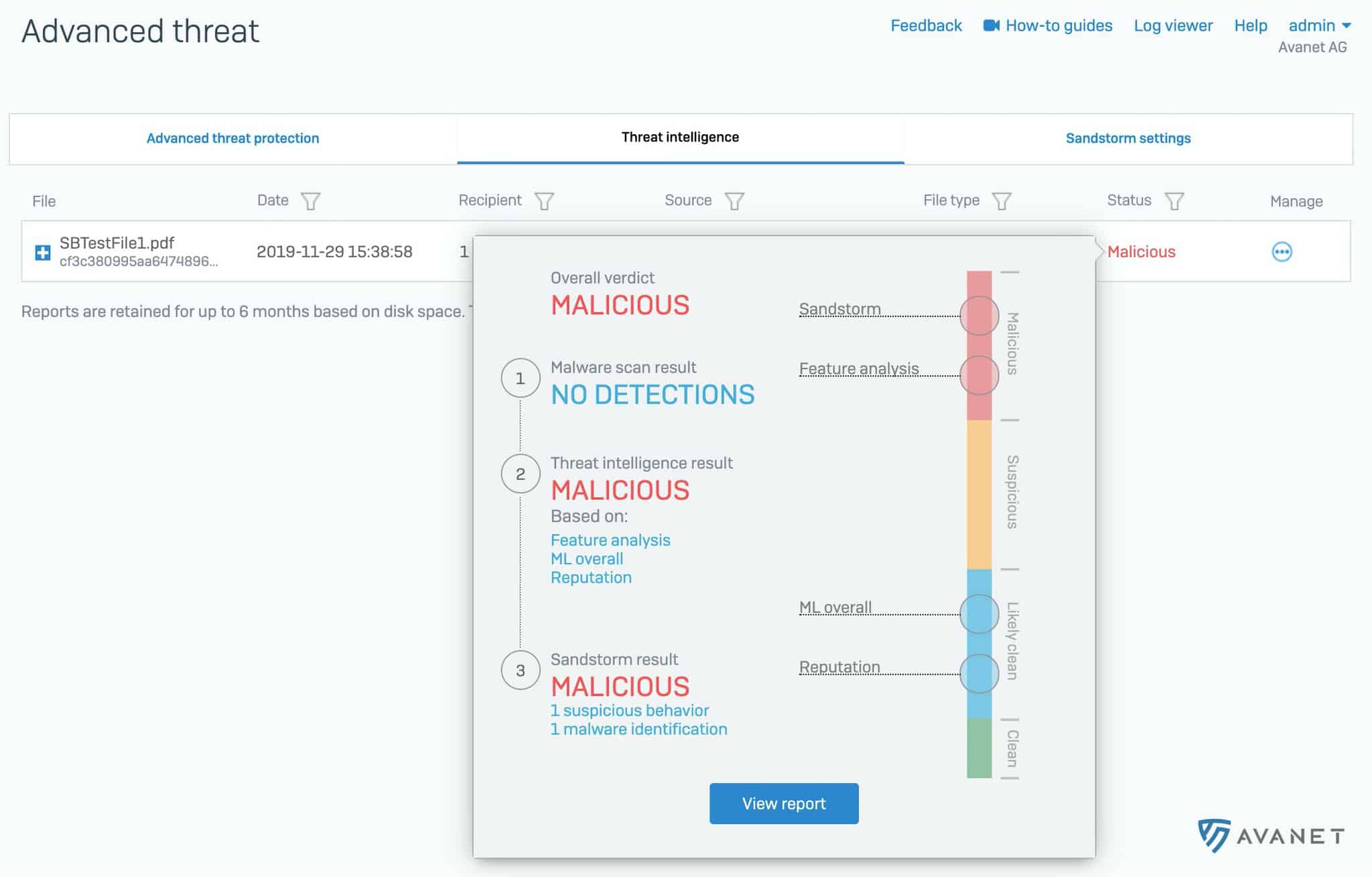 Med v18 kompletteras den befintliga Sandstorm‑modulen av den nya modulen Threat Intelligence Analysis. Medan Sophos Sandstorm analyserar webb‑nedladdningar eller e‑postbilagor granskar Threat Intelligence filer med hjälp av machine learning. Dessutom används analyserna från SophosLabs – samma teknik som ligger bakom Sophos Intercept X med EDR.