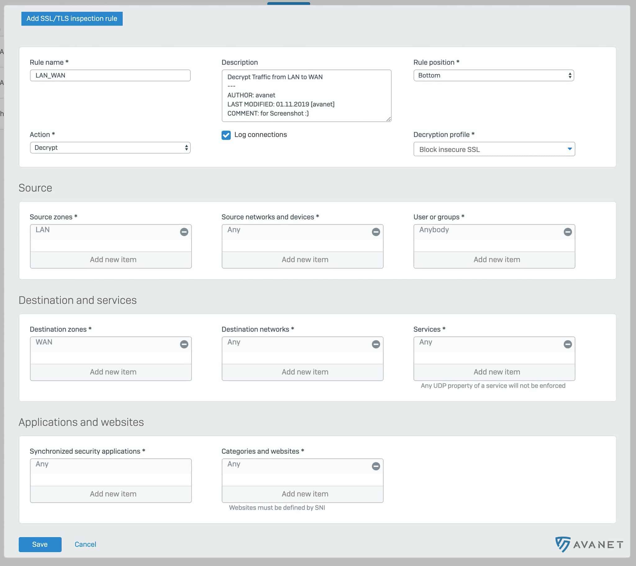 Med v18 hanteras SSL‑inspektion nu centralt genom dekrypteringsprofiler, och inspektionen tillämpas genom dedikerade brandväggsregler.